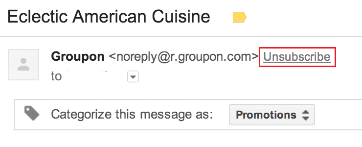 Hvis du ser på avsenderadressen vil du legge merke til en lenke til høyre som tydelig sier «Avslutt abonnement». Gmail-brukere kan klikke på denne koblingen og avslutte abonnementet på fremtidige utsendelser. Gmail har imidlertid advart om at dette kan ta opptil et par dager siden det er helt avhengig av hvor rask avmeldingsprosessen er.